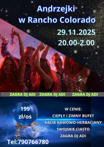 Andrzejki 2025ranchocolorado Zapraszamy na niezapomnianą imprezę Andrzejkową w Rancho Colorado! Kiedy? 29 listopada 2025, od godz. 20:00 do 2:00! Gdzie? Agroturystyka Rancho Colorado, Trzciel, Odbudowa 14a Czeka na Was: Ciepły i zimny bufet Kącik kawowo-herbaciany Swojskie ciasta Zagra DJ Adi! Cena to jedyne 199 zł/os Nie przegapcie tej wyjątkowej nocy pełnej zabawy i magii! Nie zwlekaj i już dziś zarezerwuj swoje miejsce na najlepszej imprezie tego roku +48 790 766 780! Do zobaczenia na parkiecie! Komentarze zostały zablokowane.